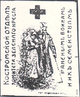 1915 1915(?) г. Разм. 40 х 48 мм. Двухцветная печать на плотной белой бумаге. В центре сестра милосердия ведет раненого под руку. Сверху знак Зеленого Креста. Слева вертикально снизу вверх текст в две строки: «Костромской отдел комитета Зеленого Креста». Справа вертикально снизу вверх текст в две строки: «Раненым воинам и их семействам». Справа внизу выходные данные мелким шрифтом: «Лит. Пешенкова. Ярос.».