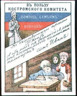 1916 1916(?) г. Разм. рамки 39 х 53 мм. Многоцветная печать на плотной белой бумаге. Сверху солдат в зимнем обмундировании на фоне российского флага. На флаге текст в четыре строки: «В пользу Костромского комитета «Помощь семьям воинов»». Внизу трое детей, один из которых пишет письмо, сидя за столом. В центре по диагонали рукописный текст письма: «В действующую армию, Тяте. А об нас не беспокойся, нам от Костромского Комитета помогут. Сын Иван».