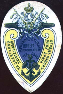 1915 1915 г. 23.02.1915 г. Виньетка в форме овала, заостренного снизу разм. 42,5 х 65 мм. Трехцветная печать на толстой белой бумаге. Сверху знак общества. В центре текст в четыре строки: «Кубанск[ое]. Отделен[ие]. Императ[орского]. Русского тех[нического]. Общ[ества].». Вниз скрещенные якорь, топор и молот. Слева и справа на V-образной ленте текст: «На санитарно-питательный отряд Кавказской армии».
