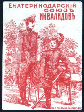 1916 1916(?) г. Разм. 45 х 62 мм. Одноцветная печать на желтоватой бумаге. В центре два инвалида на скамейке на фоне деревьев. Сверху текст в три строки: «Екатеринодарский союз инвалидов».