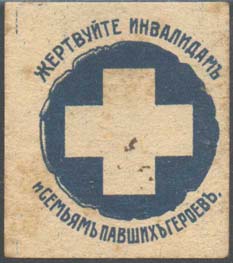 1919 1919(?) г. Разм. 38 х 43 мм. Одноцветная печать на желтоватой бумаге. В центре белый крест на фоне круглой розетки. Сверху и снизу полукругом текст: «Жертвуйте инвалидам и семьям павших героев».
