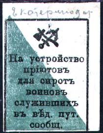 1915 1915(?) г. Разм. рамки 29 х 39 мм. Двухцветная печать на белой бумаге. Поле в внутри рамки поделено по диагонали на две части. Сверху путейский значок. Ниже текст в семь строк: «На устройство приютов для сирот воинов служащих в вед[омстве]. пут[ей]. сообщ[ения].».