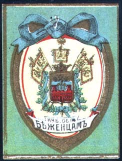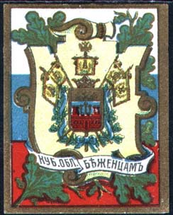1915 1915(?) г. Разм. 39 х 52 мм. Многоцветная печать на белой бумаге. В центре на фигурном щитке герб Кубанского казачьего войска. Внизу на ленте текст: «Куб[анская]. Обл[асть]. беженцам».