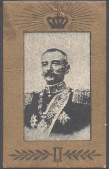 1915 1915(?) г. Разм. 35 х 57 мм. Двухцветная печать на тол-стой белой бумаге. В центре в прямоугольной рамке разм. 23 х 37 мм портрет Короля Сербии Перта I Карагеоргиевича. Сверху императорская корона. Внизу монограмма «ПI» и растительный орнамент.