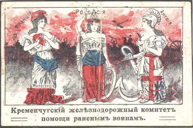 1915 1915(?) г. Разм. рамки 97 х 53 мм. Многоцветная печать на белой бумаге. В рамке аллегория тройственного союза: «Франция - милосердие, Россия - вера, Англия – надежда», на фоне боя. Внизу текст: «Кременчугский Железнодорожный Комитет помощи раненым воинам».