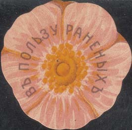 1915 1915(?) г. Виньетка сложной формы в виде цветка разм. 45 х 45 мм. Трехцветная печать на белой бумаге. Изображение цветка и текст по окружности: «В пользу раненых».
