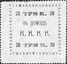 1916 1916 г. Разм рамки 36 х 36 мм. Одноцветная печать на тонкой бумаге различных цветов. Зубц. 11 1/2 и Б.З. В декоративной рамке в центре текст: «На помощь К.К.К.К.». Сверху и снизу номинал.