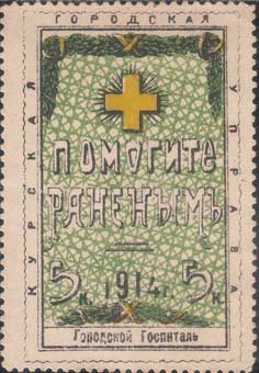 1914 1914 г. Разм. рамки 33,5 х 53 мм. Трехцветная печать на белой бумаге. Зубц. 11 1/2. С клеем. В двойной прямоугольной рамке в центре текст в две строки: «Помогите раненым». Сверху гирлянда и знак Красного Креста. Внизу номинал и дата: «1914 г.». По периметру между рамками текст: «Курская Городская Управа. Городской Госпиталь».