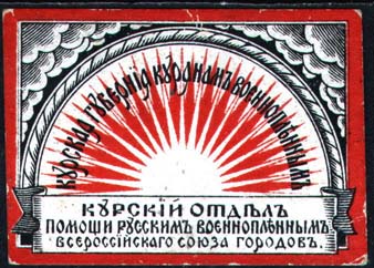 1916 1916 г. Разм. 55 х 39 мм. Двухцветная печать на толстой желтоватой бумаге с мелованным верхним слоем. В центре на фоне лучей солнца полукругом текст: «Курская губерния курянам военно-пленным». Внизу на ленте текст в три строки: «Курский отдел помощи русским военнопленным Всероссийского Союза Городов».