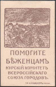 1915 1915 г. Разм. 32 х 50 мм. Одноцветная печать на тол-стой белой бумаге. Сверху в рамке с закругленными краями группа беженцев на фоне города. Внизу текст в пять строк: «Помогите беженцам. Курский комитет Всероссийского Союза городов». Справа внизу выходные данные мелким шрифтом: «Т-во А.А. Левенсон, Москва». Внизу название страны.