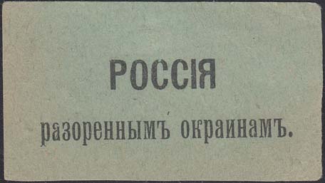 1915 1915 г. Всероссийский сбор. Разм. 76 х 42 мм. Одноцветная печать на серо-зеленой бумаге. В центре текст в две строки: «Россия разоренным окраинам».