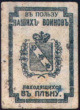1915 1915(?) г. Разм. 44 х 61 мм. Одноцветная печать на толстой желтоватой рыхлой бумаге. В тройной прямоугольной рамке разм. 37 х 54 мм в центре герб Курской губернии. Сверху текст в две строки: «В пользу наших воинов». Внизу продолжение текста в две строки: «Находящихся в плену».