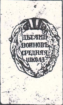 1915 1915(?) г. Разм. 40 х 67 мм. Одноцветная печать на желтоватой бумаге. В центре в венке с лентой текст в четыре строки: «Детям воинов, средняя школа».
