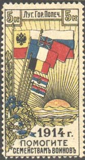 1914 1914 г. Разм. рамки 24 х 48 мм. Многоцветная печать на белой бумаге. Зубц. 11 1/2. С клеем. В прямоугольной рамке в центре флаги стран-союзниц России в Первой мировой войне на фоне восходящего солнца. Сверху текст: «Луг[анское]. Гор[одское]. Попеч[ительство]. Внизу текст в три строки: «1914 г. Помогите семействам воинов». В верхних углах номинал.