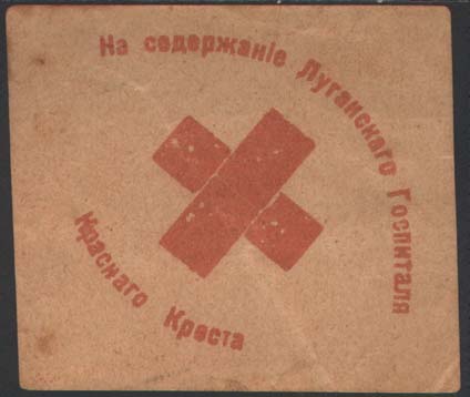 1916 1916(?) г. Ромб неправильной формы разм. 91 х 90 мм. Одноцветная печать на желтоватой бумаге. В центре красный крест. Сверху полукругом текст: «На содержание Луганского Госпиталя». Внизу полукругом продолжение текста: «Красного Креста».