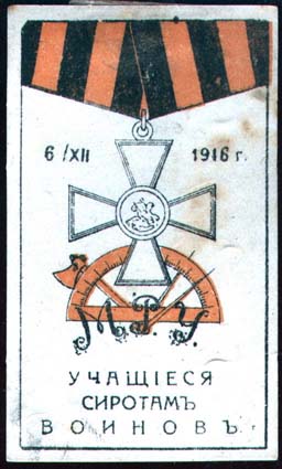 1916 1916 г. 06.12.1916 г. Разм. рамки 37 х 66 мм. Двухцветная печать на белой бумаге. В прямоугольной рамке в центре на фоне транспортира, топора и циркуля аббревиатура: «М.Р.У.». Сверху Георгиевский крест на колодке и дата: «6/XII 1916 г.». Внизу текст в три строки: «Учащиеся сиротам воинов».