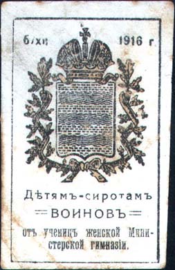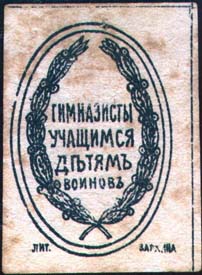 1915 1915(?) г. Разм. 33 х 46 мм. Одноцветная печать на желтоватой бумаге. В центре в двойной овальной рамке разм. 27 х 39 мм в обрамлении венка текст в четыре строки: «Гимназисты учащимся детям воинов». Внизу мелким шрифтом выходные данные: «Лит. Зархина».