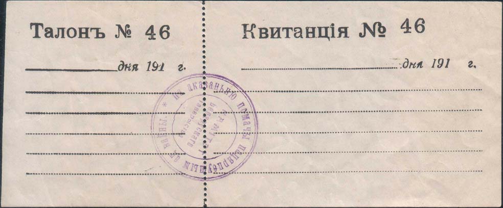 1917 1917(?) г. Квитанция с корешком разм. 165 х 68 мм. Одноцветная печать на белой бумаге. Вертикальная зубц. 11 1/2. На квитанции сверху текст в две строки: «Квитанция №...(номер) ... дня 191... г.». Ниже пять строк из точек для рукописного текста. На талоне сверху текст в две строки: «Талон № ...(Номер)... дня 191... г.». Ниже пять строк из точек для рукописного текста. На лицевой стороне фиолетовый круглой оттиск контрольной печати общества диаметром 36 мм.