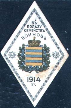 1914 1914 г. Ромб разм. рамки 34 х 53 мм. Трехцветная печать на толстой плотной желтоватой бумаге. В центре в рамке в форме ромба герб Минской губернии. Слева и справа декоративные элементы. Сверху текст в четыре строки: «В пользу семейств воинов». Внизу дата: «1914 г.».