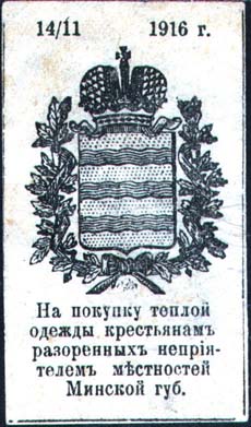 1916 1916 г. 14.11.1916 Разм. 38 х 66 мм. Одноцветная печать на тонкой желтоватой бумаге. В центре герб Минской губернии. Сверху дата: «14/11 1916 г.». Внизу текст в пять строк: «На покупку теплой одежды крестьянам разоренных неприятелем местностей Минской губ[ернии]».