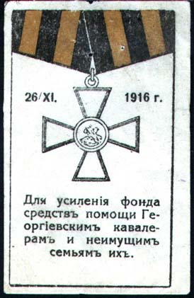 1916 1916 г. 26.11.1916 г. Разм. рамки 38 х 66 мм. Двухцветная печать на тонкой белой бумаге. Сверху Георгиевский крест и дата: «26/XI 1916 г.». Внизу текст в пять строк: «Для усиления фонда средств помощи Георгиевским кавалерам и неимущим семьям их».