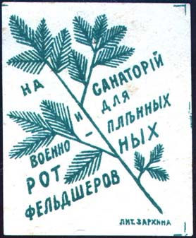 1916 1916(?) г. Разм. 45 х 56 мм. Одноцветная печать на желто-ватой бумаге. Еловая ветка и текст в шесть строк: «На санаторий и для военнопленных рот-ных фельдшеров». Справа внизу мелким шрифтом выходные данные: «Лит. Зархина». По углам знака разграничительные линии.