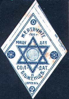 1917 1917 г. 05.-06.03.1917 г. Ромб разм. рамки 33 х 49 мм. Одноцветная печать на белой бумаге. В центре шестиконечная звезда. По углам ромба декоративные элементы в виде шестиконечных звезд. Текст: «Жертвуйте на мацу для солдат и беженцев евреев». Слева внизу с наружной стороны рамки мелким шрифтом выходные данные: «Лит. Данцига».