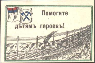 1915 1915(?) г. Всероссийский сбор. Разм. рамки 56 х 35 мм. Многоцветная двухсторонняя печать на белой бумаге. На лицевой стороне в прямоугольной рамке в центре идущий поезд. В левом верхнем углу флаг Ведомства путей сообщения. Сверху текст в две строки: «Помогите детям героев!». На оборотной стороне текст в шесть строк: «На устройство приютов для сирот служащих, мастеровых и рабочих Ведомства Путей Сообщения, павших и пострадавших на войне».