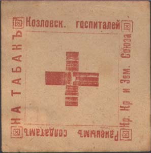 1915 1915(?) г. Разм. 50 х 50 мм. Одноцветная печать на желто-ватой бумаге. В прямоугольной рамке разм. 31 х 31 мм в центре красный крест. По наружному периметру рамки текст: «Раненым солдатам Козловск[их]. Госпиталей Кр[асного]. Кр[еста]. и Зем[ского]. Союза на табак» и декоративные элементы.