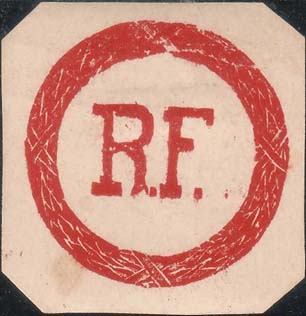 1915 1915(?) г. Разм. 39 х 39 мм. Одноцветная печать на плот-ной белой бумаге. В центре герб Франции.