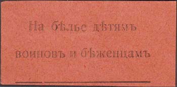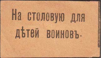1915 1915(?) г. Разм. 55 х 30 мм. Одноцветная печать на бумаге различных цветов. В центре текст в две строки: «На столовую для детей воинов».