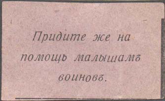 1915 1915(?) г. Разм. 56 х 33 мм. Одноцветная печать на светло-зеленой бумаге. В центре текст в три строки: «Придите же на помощь малышам воинов».