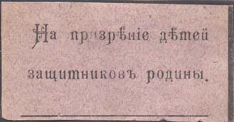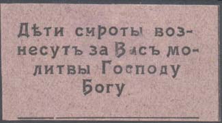 1915 1915(?) г. Разм. 54 х 29 мм. Одноцветная печать на серо-розовой бумаге. В центре текст в четыре строки: «Дети сироты вознесут за Вас молитвы Господу Богу».