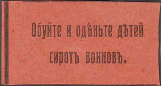 1915 1915(?) г. Разм.54 х 28 мм. Одноцветная печать на оранжево-красной бумаге. В центре текст в две строки: «Обуйте и оденьте детей сирот воинов».