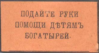 1915 1915(?) г. Разм. 55 х 28 мм. Одноцветная печать на оранжевой бумаге. В центре текст в три строки: «Подайте руки помощи детям богатырей».