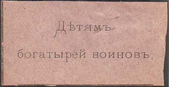 1915 1915(?) г. Разм. 55 х 28 мм. Одноцветная печать на серо-розовой бумаге. В центре текст в две строки: «Детям богатырей воинов».