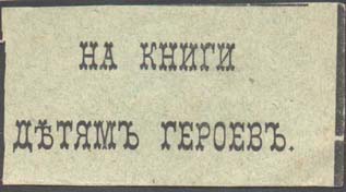 1915 1915(?) г. Разм. 55 х 28 мм. Одноцветная печать на зелено-серой бумаге. В центре текст в две строки: «На книги детям героев».
