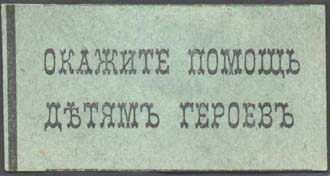 1915 1915(?) г. Разм. 55 х 28 мм. Одноцветная печать на зеленой бумаге. В центре текст в две строки: «Окажите помощь детям героев».