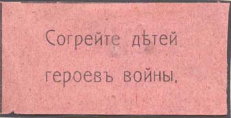 1915 1915(?) г. Разм. 55 х 28 мм. Одноцветная печать на бумаге различных цветов. В центре текст в две строки: «Согрейте детей героев войны».