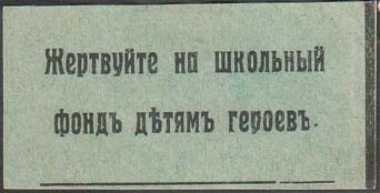 1915 1915(?) г. Разм. 55 х 28 мм. Одноцветная печать на бумаге различных цветов. В центре текст в две строки: «Жертвуйте на школьный фонд детям героев».