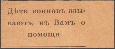 1915 1915(?) г. Разм. 55 х 28 мм. Одноцветная печать на бумаге различных цветов. В центре текст в три строки: «Дети воинов взывают к Вам о помощи».