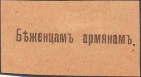 1915 1915(?) г. Разм. 55 х 28 мм. Одноцветная печать на желтой бумаге. В центре текст: «Беженцам армянам».