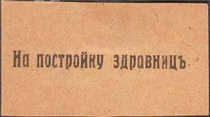 1915 1915(?) г. Разм. 55 х 28 мм. Одноцветная печать на желтой бумаге. В центре текст: «На постройку здрав-ниц».