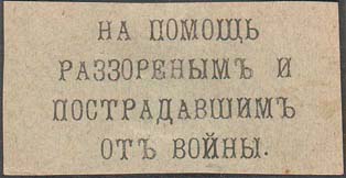 1915 1915(?) г. Разм. 55 х 28 мм. Одноцветная печать на серо-зеленой бумаге. В центре текст в четыре строки: «На помощь разоренным и пострадавшим от войны».