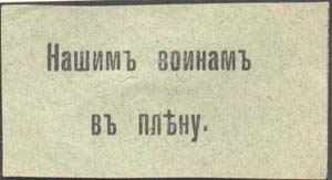 1915 1915(?) г. Разм. 55 х 28 мм. Одноцветная печать на серо-зеленой бумаге. В центре текст в две строки: «Нашим воинам в плену».
