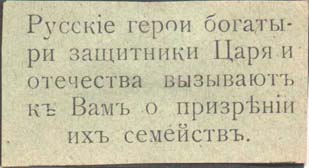 1915 1915(?) г. Разм. 55 х 28 мм. Одноцветная печать на серо-зеленой бумаге. В центре текст в пять строк: «Русские герои богатыри защитники Царя и отечества взывают к Вам о призрении их семейств».