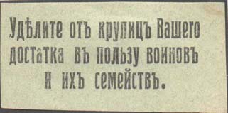 1915 1915(?) г. Разм. 55 х 28 мм. Одноцветная печать на серо-зеленой бумаге. В центре текст в три строки: «Уделите от крупиц Вашего достатка в пользу воинов и их семейств».