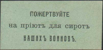 1915 1915(?) г. Разм. 70 х 28 мм. Одноцветная печать на зеленой бумаге. В центре текст в три строки: «Пожертвуйте на приют для сирот наших воинов».