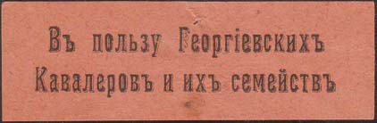 1915 1915(?) г. Разм. 70 х 20 мм. Одноцветная печать на оранжевой бумаге. В центре текст в две строки: «В пользу Георгиевских Кавалеров и их семей».