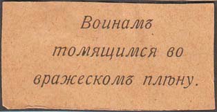 1915 1915(?) г. Разм. 55 х 30 мм. Одноцветная печать на бумаге различных цветов. В центре текст в три строки: «Воинам томящимся во вражеском плену».